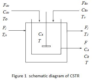 Reactant A and B is continuously fed to the reactor with a volumetric flow rate FA0 and FB0, a molar concentration CA , and CB temperature T0. The contents are uniformly mixed by motorized agitator. An exit stream, which contains a mixture of reactant A and B and product C and D, is withdrawn from the reactor continuously with a volumetric flow rate F. The prescribed reaction is exothermic and it is necessary to add a cooling jacket to keep it temperature below 315K. A coolant stream volumetric flow rate Fj and inlet temperature Tj0 continuously takes out the heat to maintain the described reaction temperature.